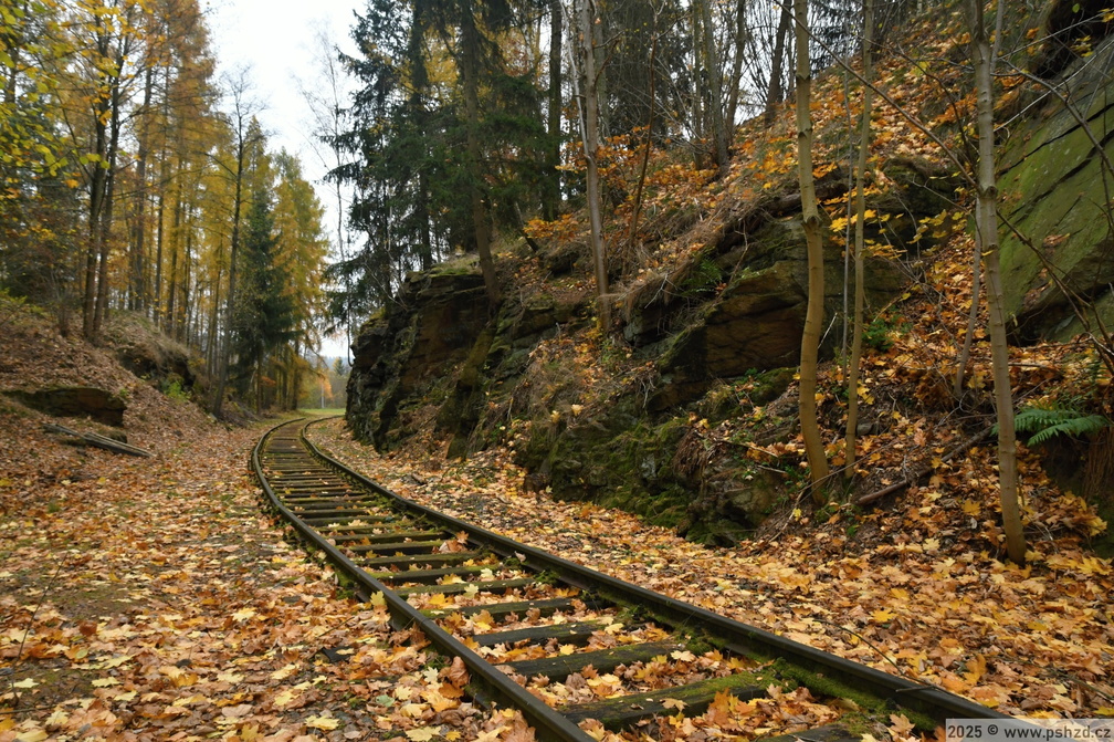 Úsek kolejí před Sázavou. Koleje nejsou původní, je vidět, že byly položeny bez podbití na původní lože.